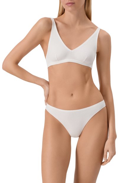 Бюстгальтер Cocoon выполнили из рифленого трикотажа на основе сертифицированного Oeko-Tex® органического хлопка. Модель с треугольными чашечками без косточек и узкими регулируемыми бретелями застегивается парой крючков сзади.