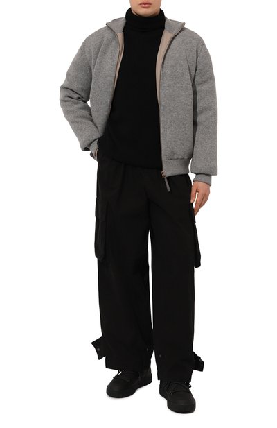 Сапоги с шерстяной внутренней отделкой и мембраной выполнили из технического текстиля и искусственной кожи. Модель на широкой протектор ной подошве дополнили петлей на заднике и двумя ремешками велкро с брендированным патчем на одном из них.
