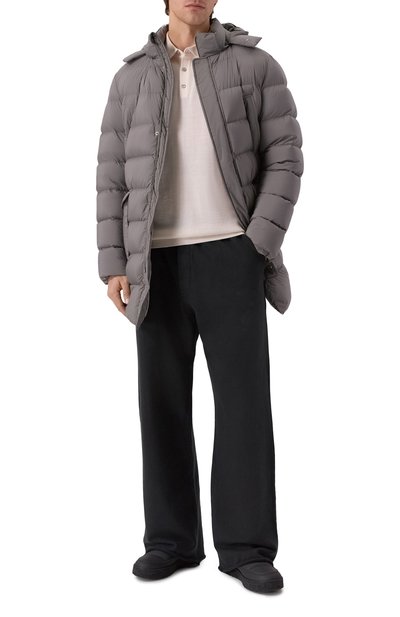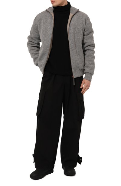 Сапоги с шерстяной внутренней отделкой выполнили из влагостойкого текстиля и искусственной кожи. Пару на полимерной протекторной подошве дополнили боковой молнией с пуллером-эмблемой и ремешком велкро с брендированным патчем.