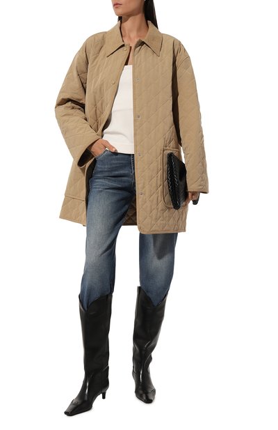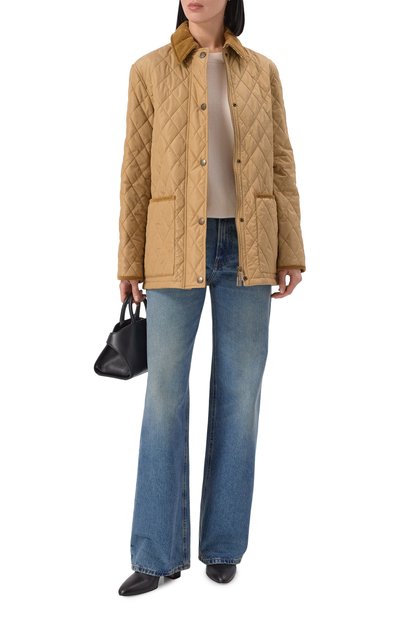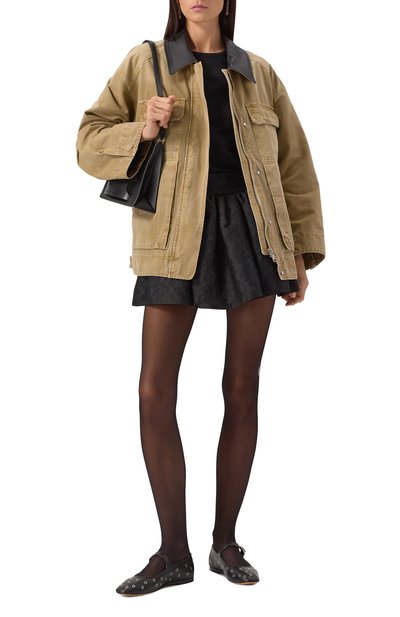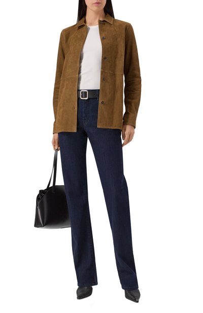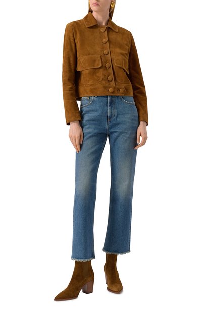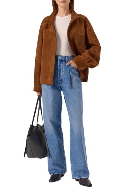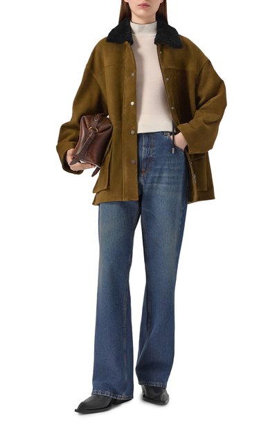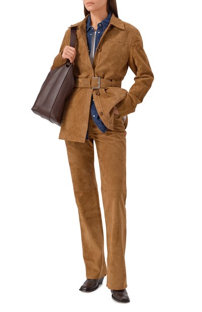 Куртку со спущенной линией плеч и двумя большими карманами по бокам выполнили из замши. Кожаный отложной воротник дополнили съемной накладкой. Модель застегивается молнией, скрытой под планкой с кнопками.