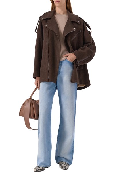 Куртку со спущенной линией плеч и двумя большими карманами по бокам выполнили из замши. Кожаный отложной воротник дополнили съемной накладкой. Модель застегивается молнией, скрытой под планкой с кнопками.