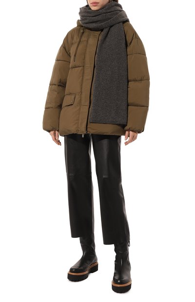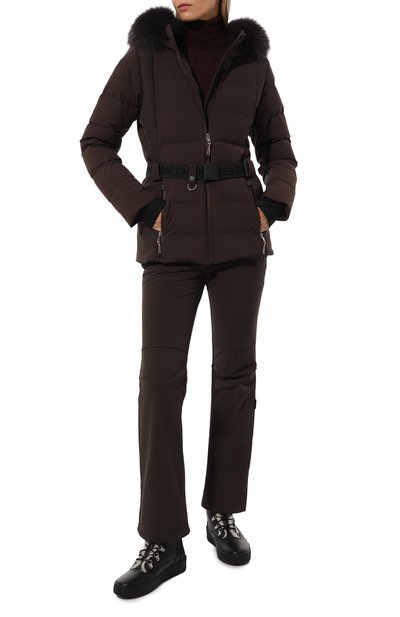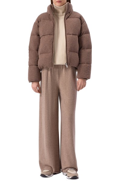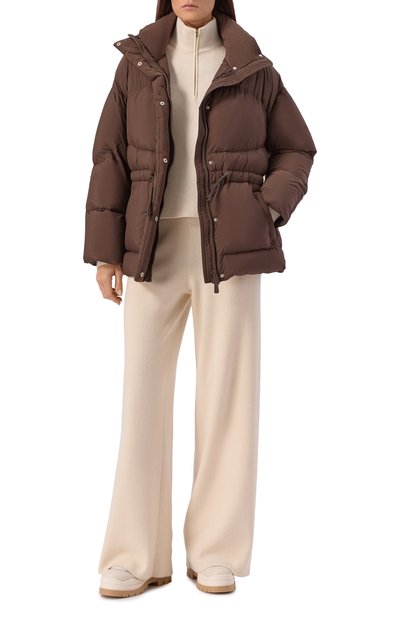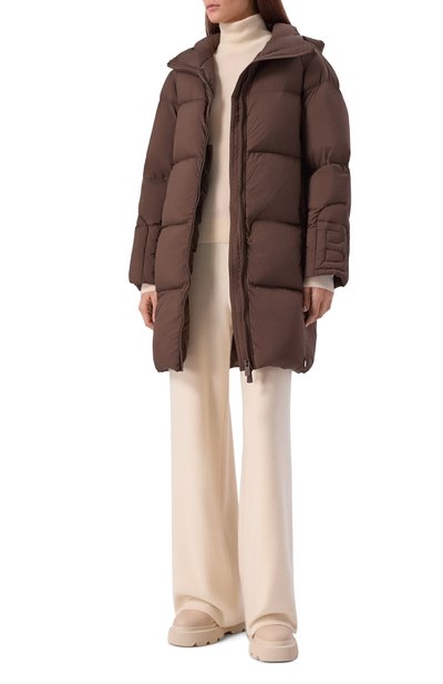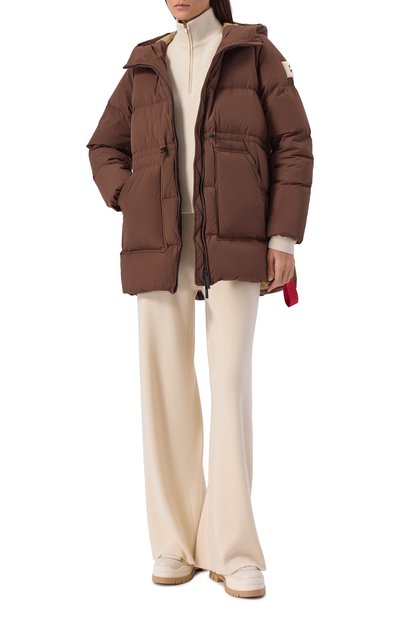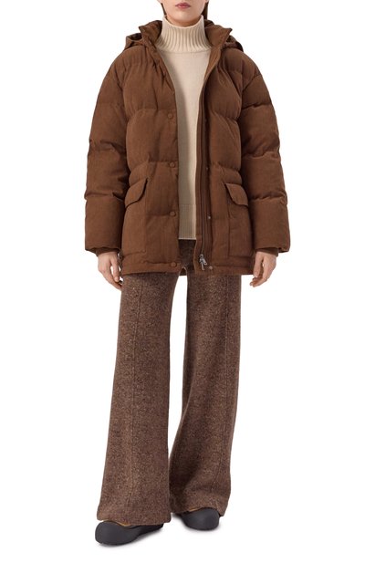 Укороченную пуховую куртку с трикотажными манжетами выполнили из полиэстерового вельвета. Модель с отстегивающимся капюшоном и боковыми карманами застегивается молнией, скрытой под планкой с кнопками.