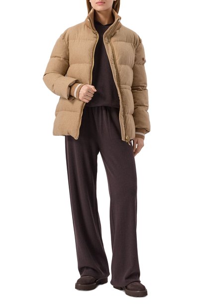 Стеганую куртку на пуху выполнили из кашемирового трикотажа. Модель с воротником-стойкой дополнили рифлеными манжетами и кантом на боковых карманах. Пуховик с петлей сзади застегивается молнией с брендированным пуллером.