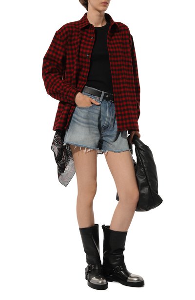 Клетчатую рубашку со спущенной линией плеч и нагрудным карманом выполнили из хлопковой фланели. Края модели подчеркнули короткой бахромой.