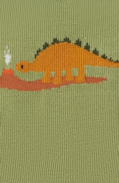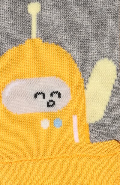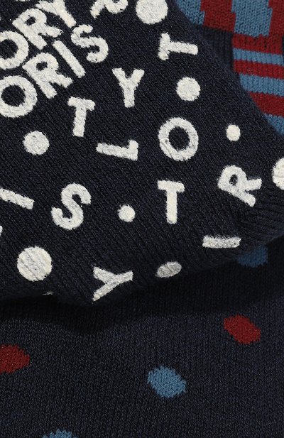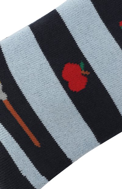 Полосатые носки School Supplies с плюшевой изнанкой выполнили из эластичного трикотажа We Care на основе хлопка и полиамида. Модель декорировали жаккардовыми узорами на школьную тему и надписью Let’s be Creative на внутренней стороне манжеты в рубчик.