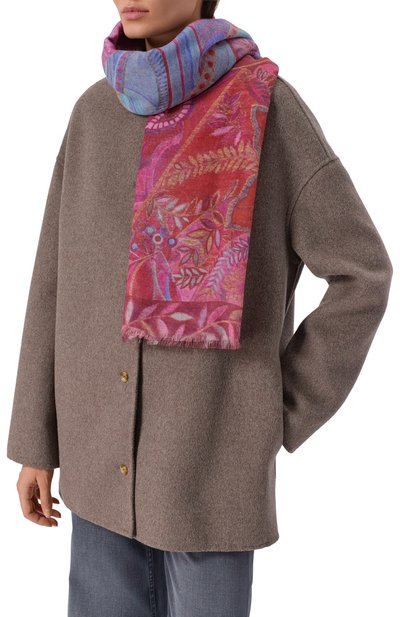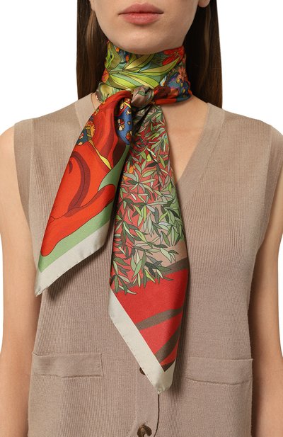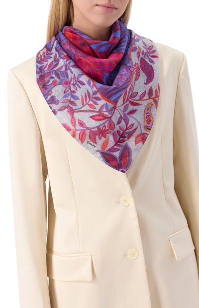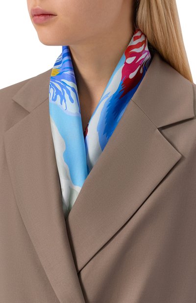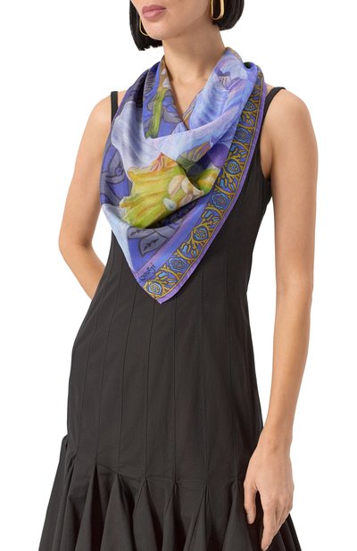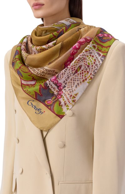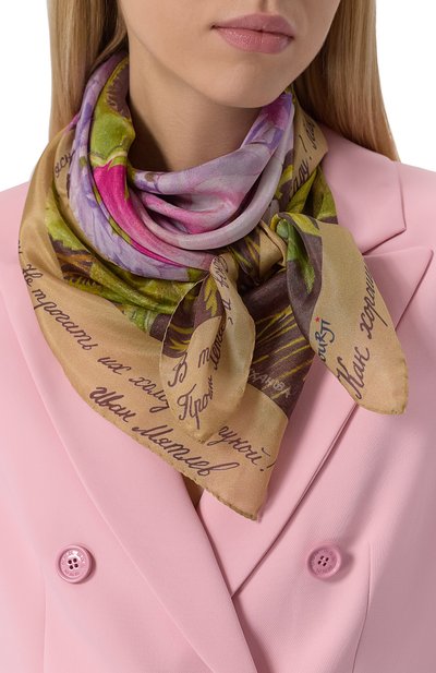 Для изготовления квадратной шали с подшитыми вручную краями использовали чистый шелк. Модель украсили принтом «Пионы», созданным художницей Еленой Мухановой.