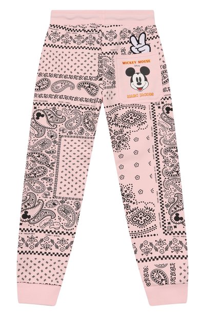 Джоггеры из коллаборации с Disney выполнили из хлопкового трикотажа с принтом пейсли. Модель с регулируемым поясом-кулиской дополнили врезными боковыми карманами и накладным задним, декорированным надписями, вышивкой и изображением Микки Мауса.
