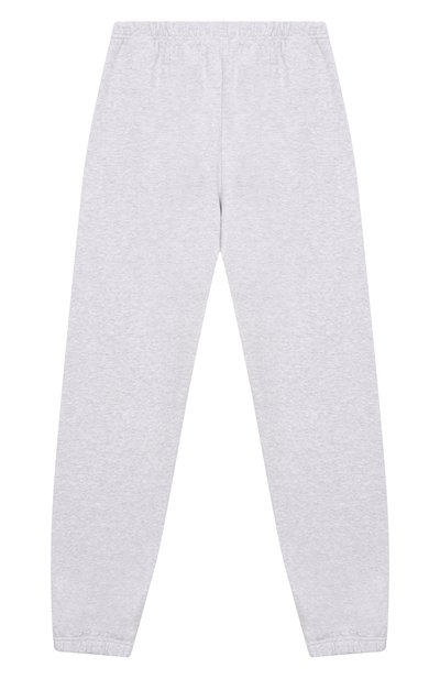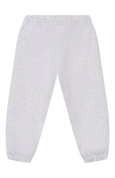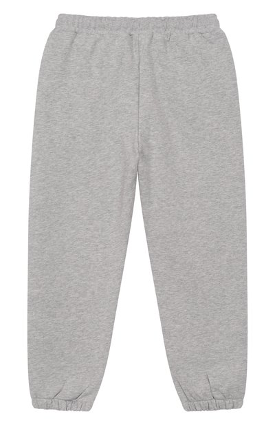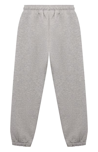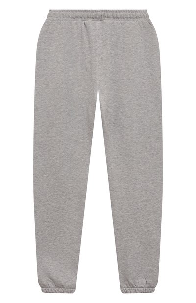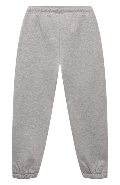 Джоггеры с широким поясом-кулиской и манжетами в рубчик выполнили из меланжевого хлопкового трикотажа. Модель дополнили двумя карманами по бокам и еще одним накладным сзади, украшенным логотипом марки.