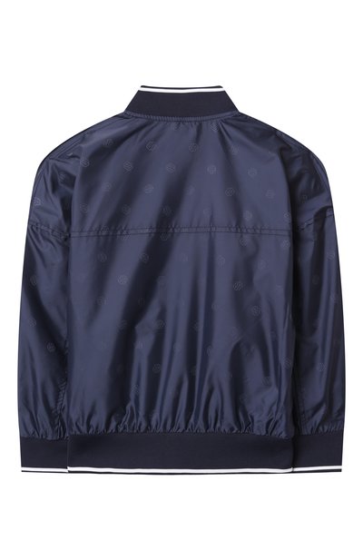 Утепленный бомбер с двумя врезными карманами сшили из хлопкового вельвета с добавлением полиэстера. Куртку с воротником, манжетами и поясом из трикотажа в полоску украсили фирменными аппликациями с двух сторон.