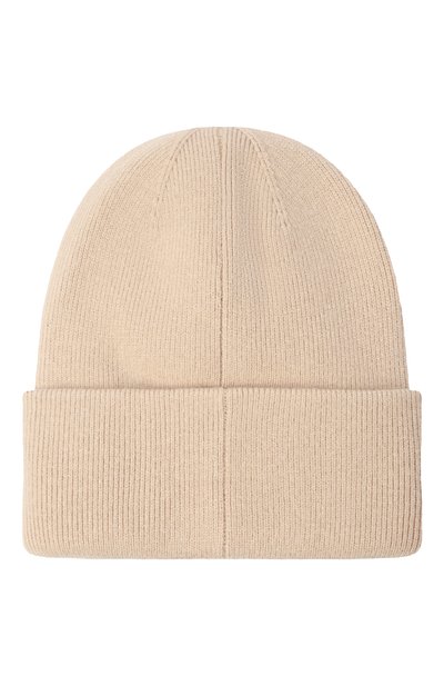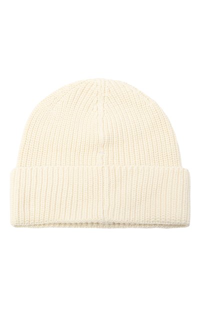 Шапку бини с жаккардовым фирменным паттерном украсили помпоном. Аксессуар связали из пряжи на основе органического хлопка с добавлением шерсти.