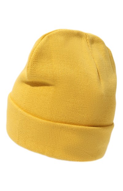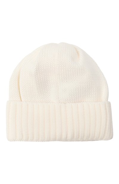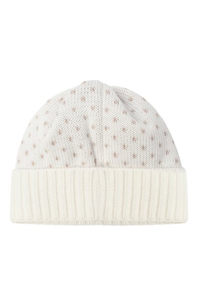 Шапку бини с жаккардовым фирменным паттерном украсили помпоном. Аксессуа р связали из пряжи на основе органического хлопка с добавлением шерсти.