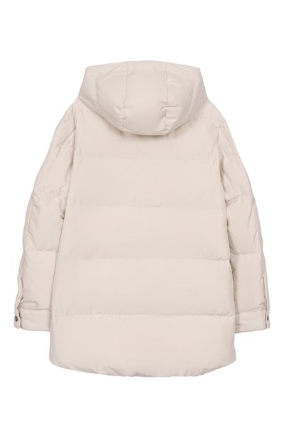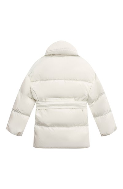 Пуховик из полиэстера дополнили фестончатыми манжетами и воротником из хлопкового трикотажа с добавлением шерсти. По бокам предусмотрели карманы и разрезы на кнопках. Куртку с брендированным кожаным патчем утеплили гусиным пухом и пером.