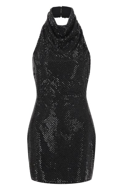 Мини-платье из эластичного полиэстера украсили гранеными кристаллами со всех сторон. Модель с открытой спиной и драпировками спереди застегивается крючками и потайной молнией сзади.