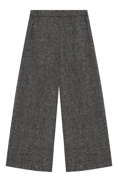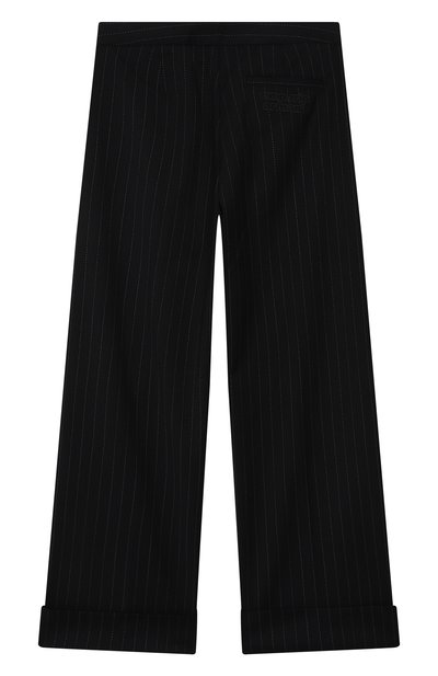 Широкие брюки со стрелками выполнили из эластичного микса полиэстера и вискозы в серебристую полоску. Один из боковых врезных карманов украсили фирменной вышивкой.