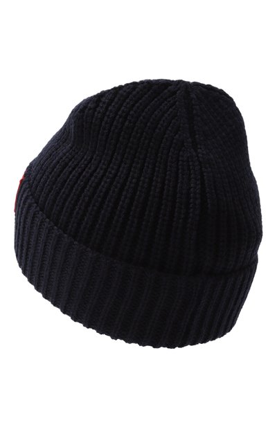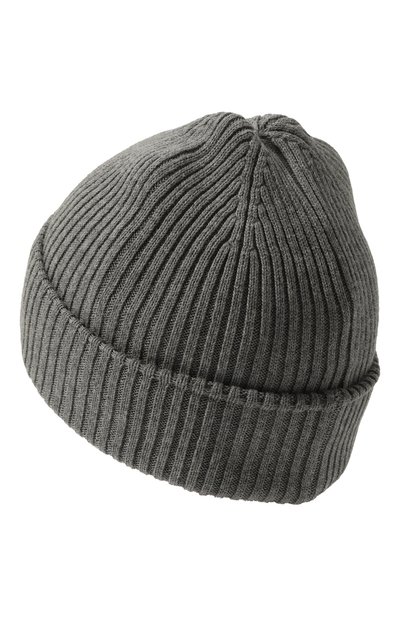 Шапку бини связали узором в рубчик из хлопковой пряжи. Широкий отворот аксессуара декорирован резиновым патчем с логотипом.