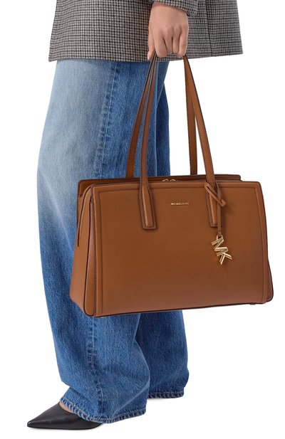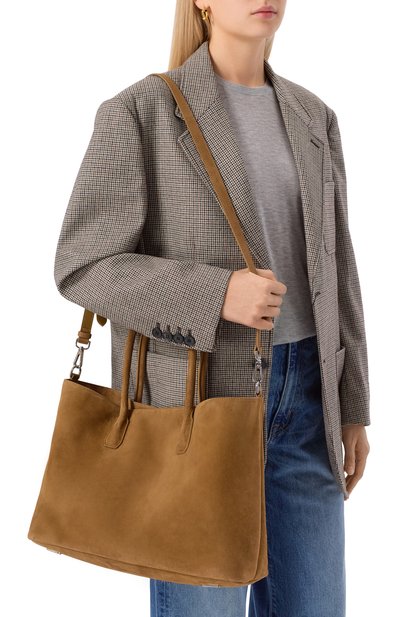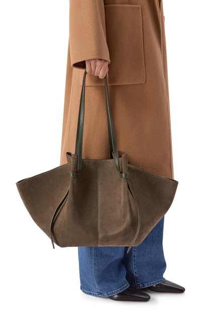 Сумку Trapeze с двумя короткими ручками и съемным ремнем выполнили из замши, произведенной на фабрике в итальянском городе Арциньяно. Внутри аксессуар из капсулы GI дополнили тремя карманами.