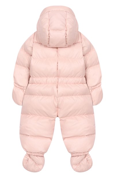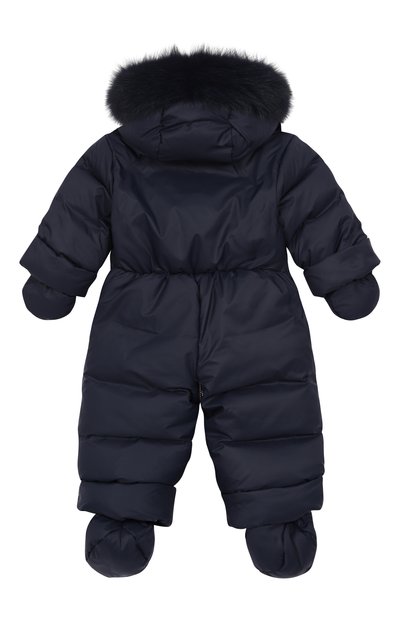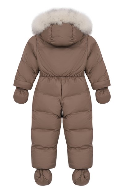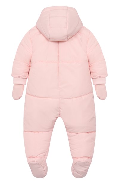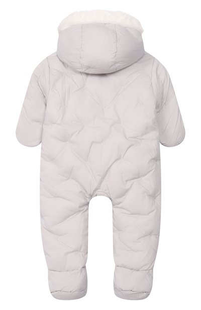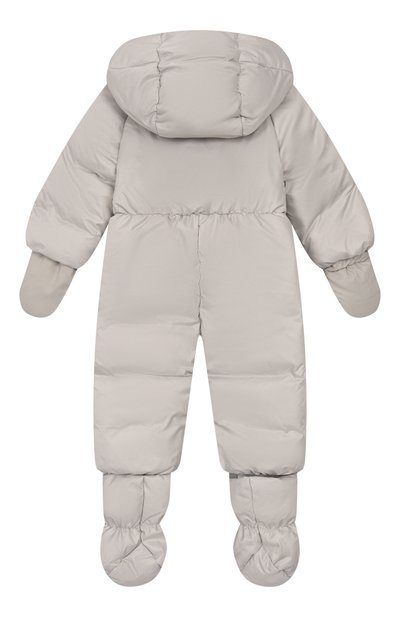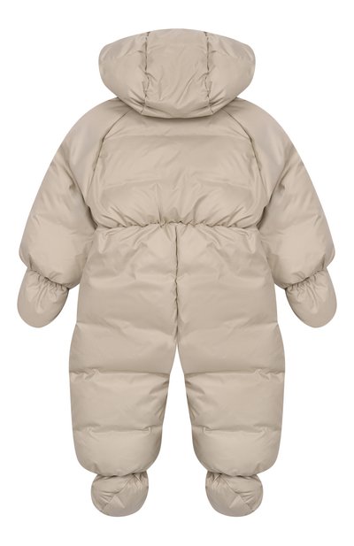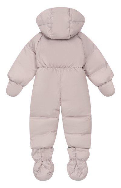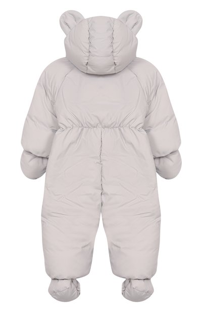 Пуховый комбинезон «Зайки-Побегайки» с вышитым паттерном в виде зайцев выполнили из ветро- и влагостойкого полиэфира. Модель с капюшоном, съемными пинетками и варежками застегивается потайной молнией спереди.