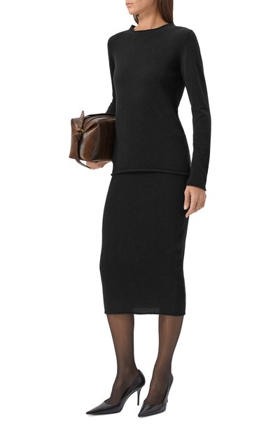 Юбку-карандаш на вискозном подкладе выполнили из глянцевого стрейчевого винила. Модель с боковыми карманами и высокой шлицей застегивается потайной молнией сзади.