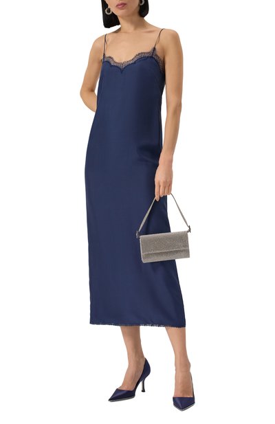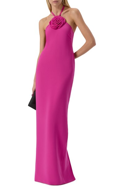 Приталенное макси-платье с вырезом «лодочкой» и скульптурными вытачками сшили из бархата. Однотонная модель без декора застегивается потайной молнией сзади.