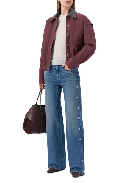 Джинсы oversize сшили из плотного хлопкового денима. Пояс украсили брендированным патчем. Модель со средней посадкой дополнили пятью карманами.